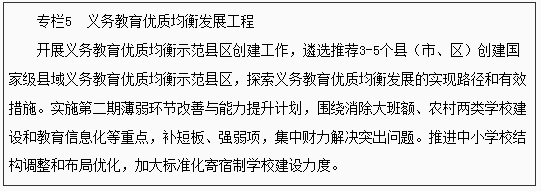 ——义务教育优质均衡发展迈上新台阶。义务教育学校办学条件全部达到国家底线要求和省定办学标准,县域内城乡义务教育一体化发展,力争通过国家义务教育优质均衡发展督导评估认定的县(市、区)达到20%以上。