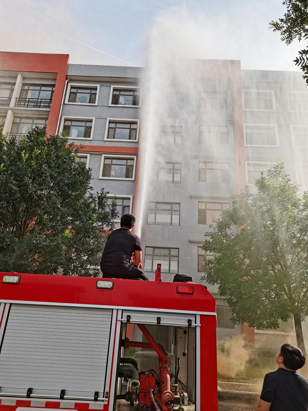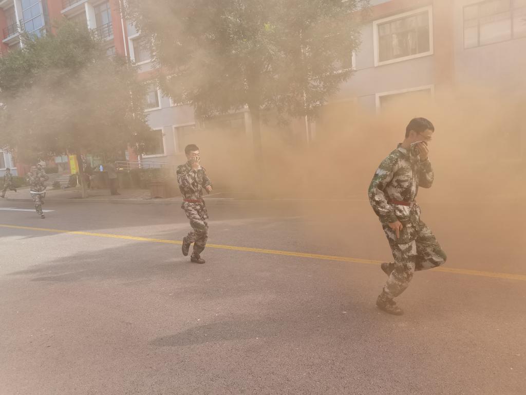 首先由孙光辉副院长下达开始演习命令。一号学生公寓模拟突发火险,警报声响起,只见浓烟瞬间布满公寓,公寓管理人员立即切断电源,打开疏散通道,学生在教官们的指挥下,立即按照从高到低的顺序,依次快速、安全的疏散。同时向校保卫部报警,接到报警后,保卫部立即出动消防车到达火场,展开灭火行动,架设水炮,向起火处喷射灭火。在演习各小组的密切配合下,学生安全疏散,经过清点人数,参加演习学生全部安全疏散至操场。