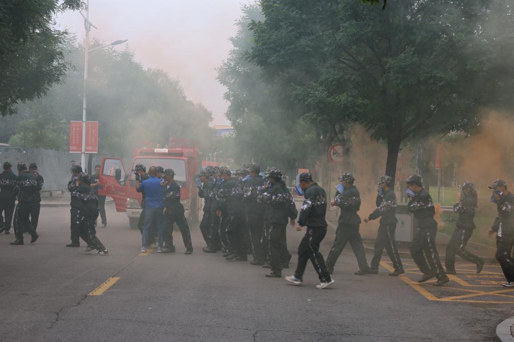 党委委员、副院长兼演习总指挥葛波蔚下达了开始演习的指令,随着警报声的响起,参加演习的同学在指导老师的带领下,用毛巾捂好口鼻,由疏散通道安全、有序的向操场撤离,顺利的完成疏散演习。