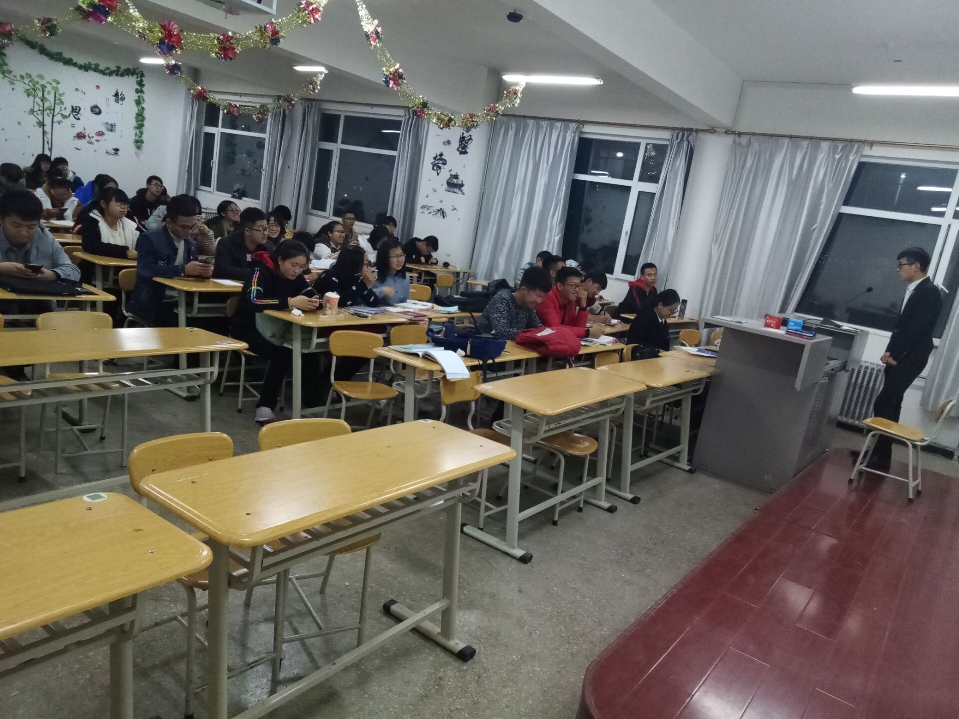 11月25日晚19:00我院测绘工程在3号教学楼309教室举办了道德讲座,此次讲座分为6个环节,分别道德的起源、道德的作用、诵经典、唱歌曲、党的十九大中关于道德的指示和谈体会。其中谈到,党的十九大报告中,习近平总书记指出:“加强思想道德建设。”人民有信仰,国家有力量,民族有希望。历史和现实都表明,一个国家的繁荣强盛,一个民族的文明进步,很大程度上取决于社会思想道德水平。党的十九大对加强思想道德建设作出重大部署,强调要提高人民思想觉悟、道德水准、文明素养,提高全社会文明程度。在温馨和谐的氛围中,同学们积极发表自己的看法和见解。