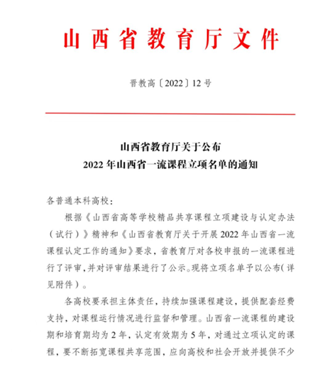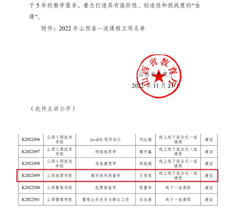 近日,山西省教育厅公布了2022年山西省一流课程立项名单。我系测绘教研室王雪英老师团队申报的《数字地形测量学》成功入选,获批省级线上线下混合式一流建设课程。
