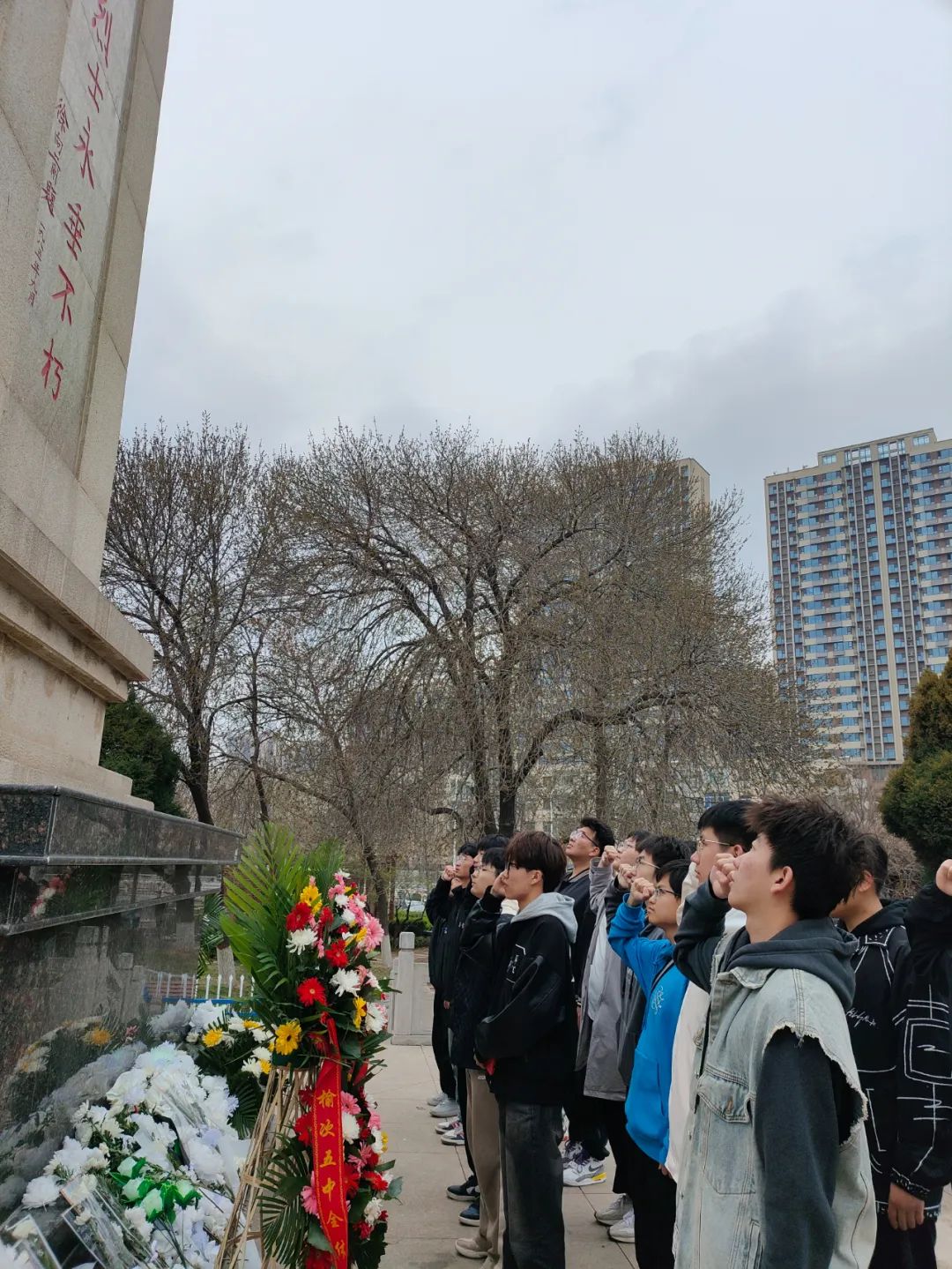 面向巍然耸立的纪念碑,同学们在李诗涵同学的带领下,举起右拳庄严宣誓,铮铮誓言回荡在纪念碑下,大家必将传承红色基因,赓续红色血脉,让先烈染红的旗帜永远飘扬在祖国的蓝天!