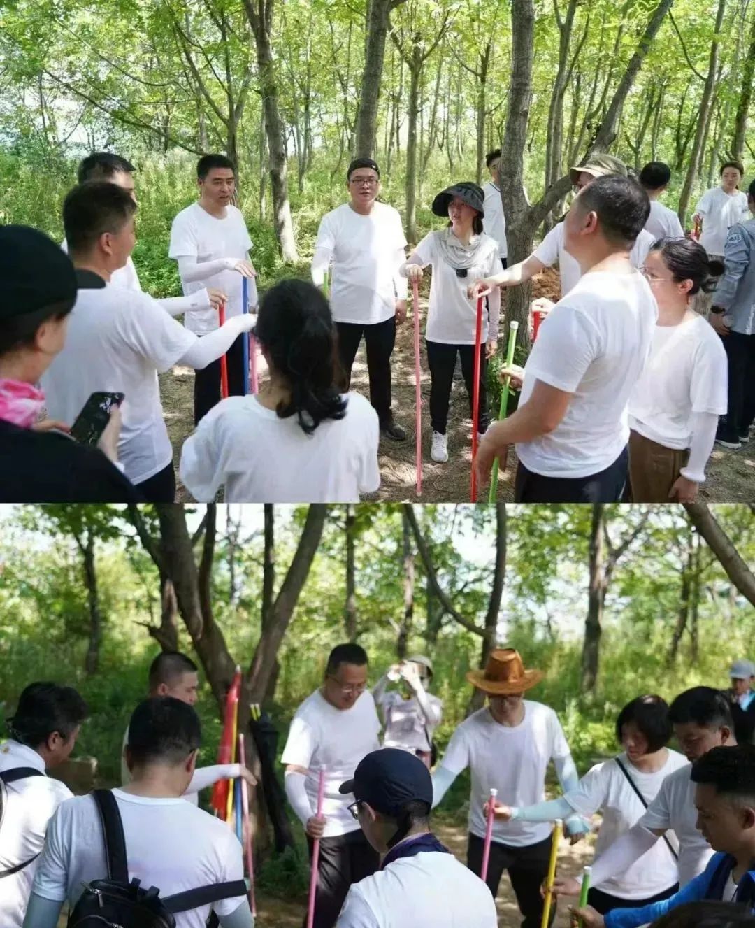2.宣布开始前,双脚开立,不允许移动,开始后大家按自己相同的口令,在保证自己直立杆子不倒的前提下,迅速移动步伐按顺时针将右手掌心按到相邻的同伴的杆上,保持不倒: