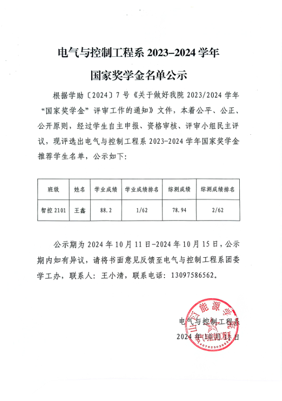 电气与控制工程系2023-2024学年 国家奖学金名单公示