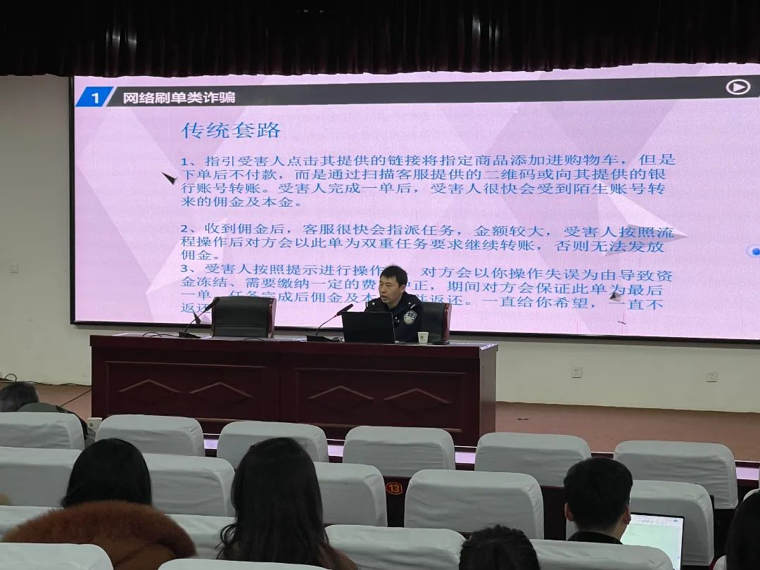 随后,警官给同学们介绍了目前电信诈骗的整体情况,对近三年省高校发案情况进行了分析,并结合典型案例及防范提示视频生动地讲解了常见的诈骗手段、最新的反诈骗知识、实用的识骗技巧,提醒同学们时刻紧绷防范之弦,谨防电信网络诈骗。
