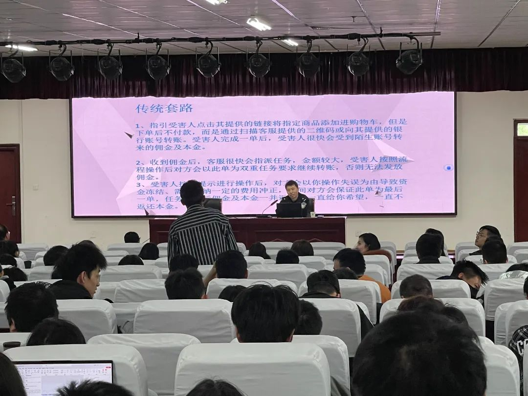 首先,刑侦支队的警官结合近年来发生的不同类型的诈骗事故案例,以民警、诈骗人、受害者不同的角度,对诈骗经过进行深入分析,向大家展示不同角色的在整个过程的心理活动,深层剖析受害人被骗原因,让同学们深刻认识到诈骗活动的隐蔽性及危害性,了解到面对不同诈骗手段时候应该采取的有效措施。