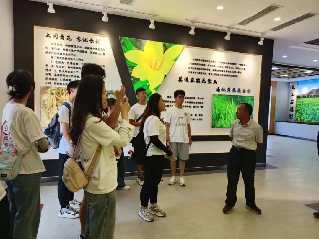 8月8日,实践队员在大同花倾城田间农业发展有限公司负责人杨旗的带领下参观了大同花倾城黄花菜博物馆。在博物馆中,实践队员紧跟负责人的脚步,零距离地观摩整个黄花菜发展历史以及各种黄花菜产品。习近平总书记参观走访时曾说道,“你们这里是黄花菜大产业,这个产业还真是有发展前途。一定要保护好、发展好这个产业,让它作为人民群众致富的好门路”。相信大家一定会牢记习近平总书记嘱托,继续把黄化产业做大做强。