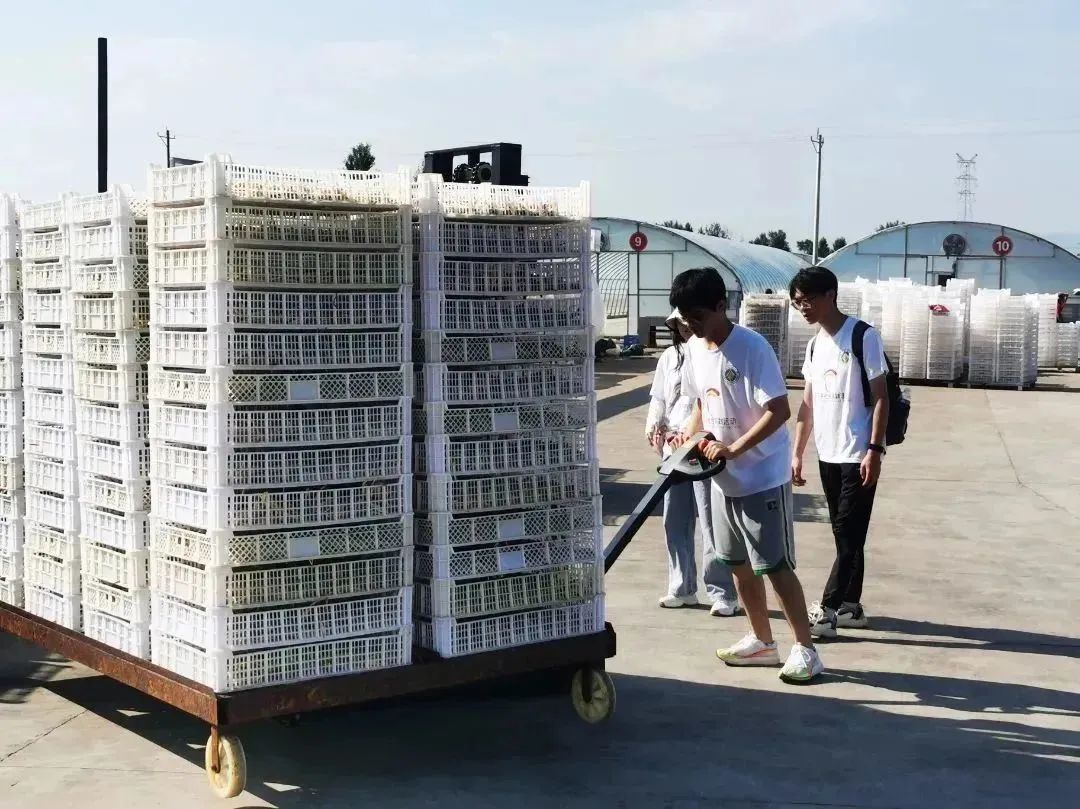 第三步,将蒸好的黄花用叉车运到空地上,每一车黄花都间隔分布,方便于工作人员进行黄花晾晒,实践队员在工作人员指导下学习叉车的使用方法,并用叉车将黄花运送到指定地点。