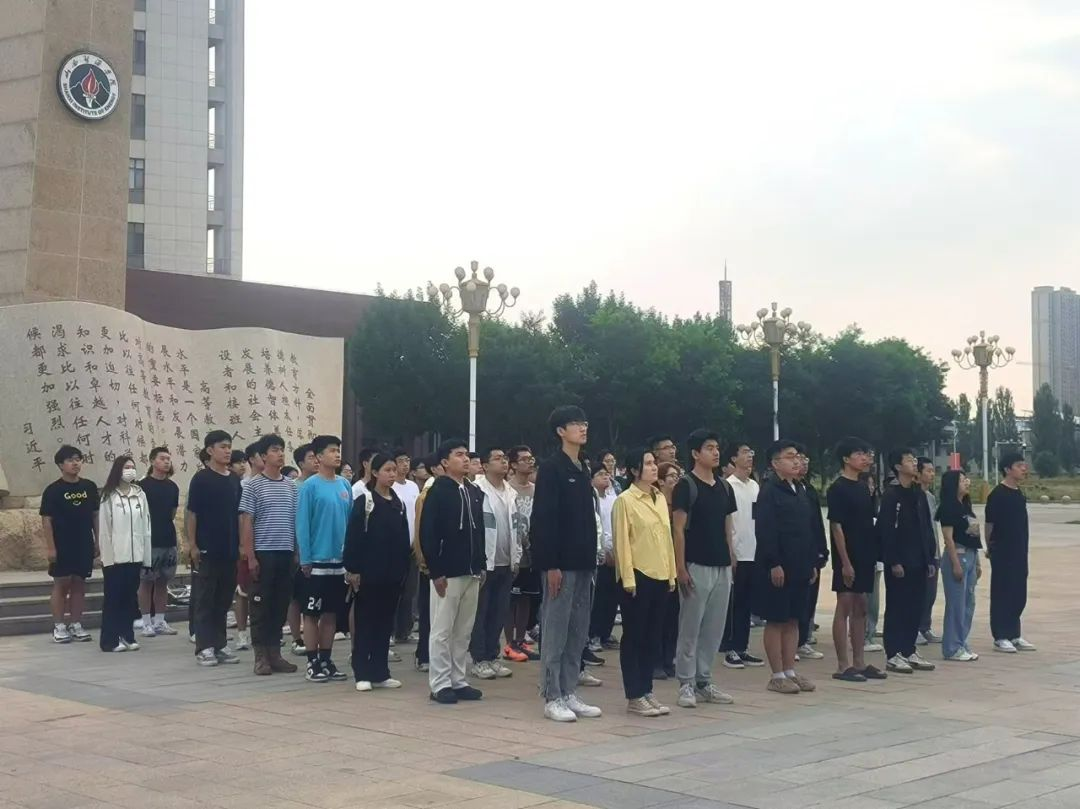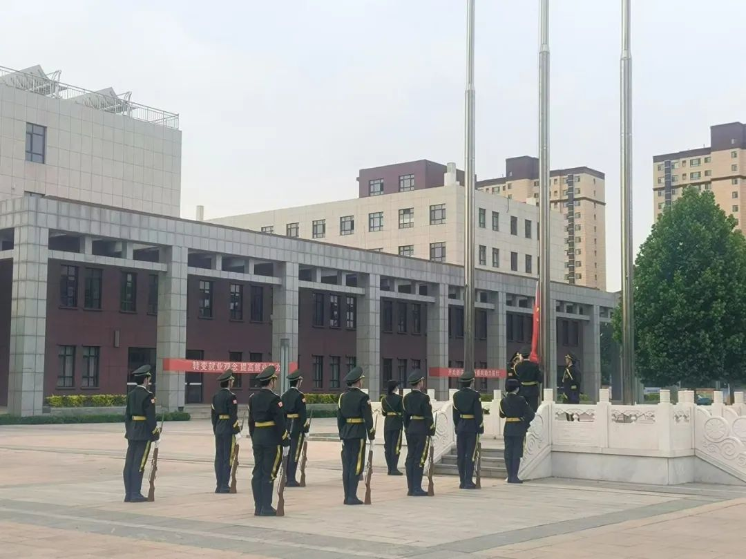 全体师生面向国旗肃立敬礼,随着激昂的《义勇军进行曲》,注视着五星红旗冉冉升起,在晨风中飘扬。