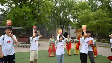 实践队员与艺术家进行交流并体验了这一过程,首先把碗固定在头顶,这可不是一件容易的事情,需要保持平衡和稳定,最后在艺术家们耐心的指导下,他们渐渐沉浸其中,成功顶起了灯。