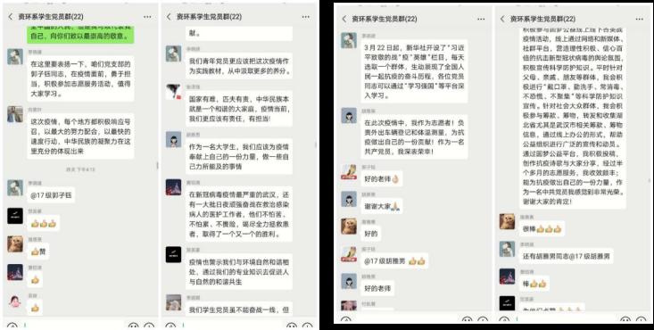 在抗击疫情的关键时期,我系开展这次主题党日活动意义重大。作为一名共产党员,我们在致敬战“疫”英雄的同时,也感恩战“疫”英雄不计报酬、不论生死的付出,感恩各行业人员无畏奉献、无私大爱的情怀,感恩医务人员白衣执甲逆风行,解放军闻令即动挑重担,社区工作者坚守一线战风雨,公安干警抗疫一线铸警魂,基层干部坚守阵地勇担当,下沉干部挺身而出守防线,志愿者微光成炬照征程,科技工作者争分夺秒与病魔较量,武汉人民英勇抗疫为我们创造的“清洁世界”。我系党员纷纷表示:抗“疫”要从自身做起,发挥好党员的模范带头作用,在保护自己、保护家人的前提下,凝心聚力,为疫情作出一份贡献。