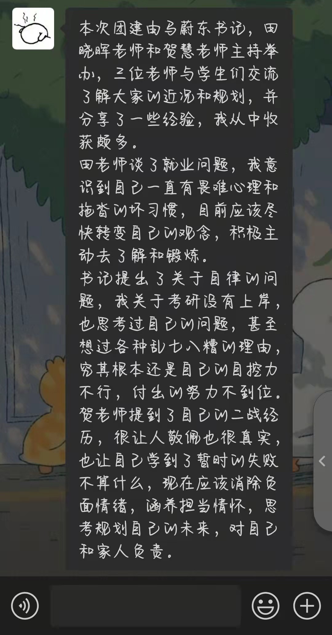 一语惊醒梦中人,接着同学们畅所欲言聊学习、聊考研、聊就业,聊未来,他们的情绪得到了释放,他们的心声我们听到了,他们的诉求有了回应,他们得到了进一步的关心,他们的脸上露出了开心的笑容……