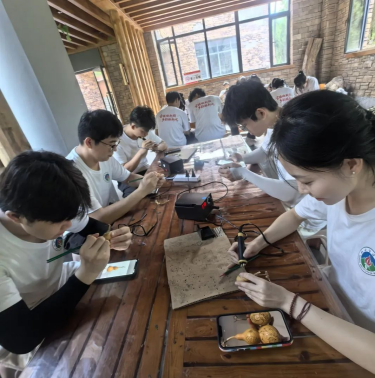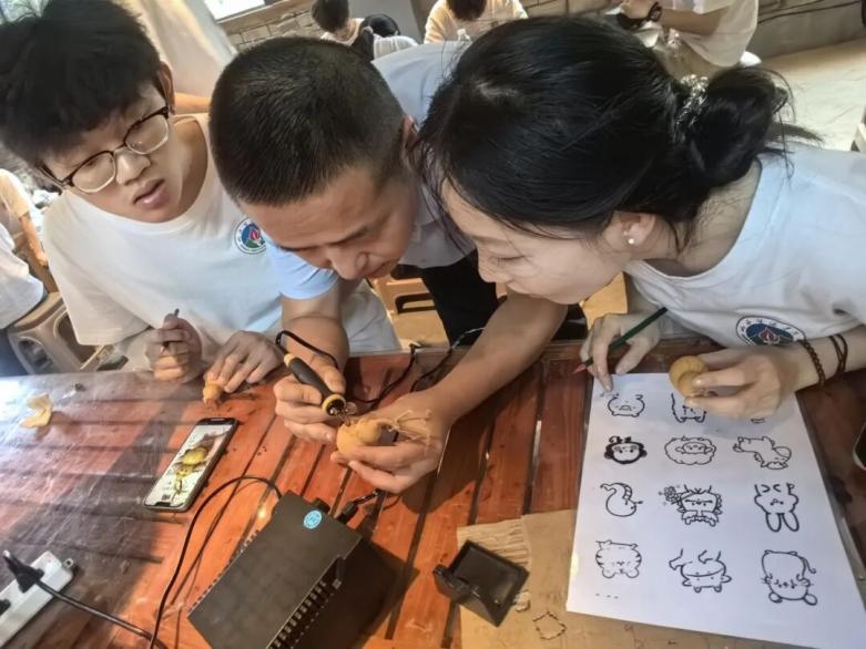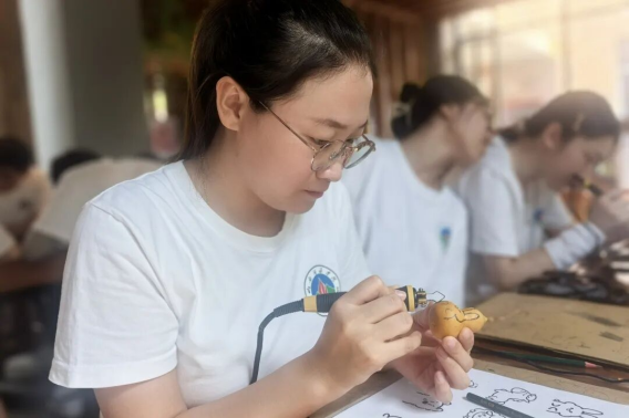 下午,同学们前往葫芦烙画工作室,开启了一场非物质文化遗产的体验之旅。葫芦烙画作为一项独具特色的传统技艺,承载着丰富的文化内涵和历史记忆。在充满艺术氛围的工作室里,同学们在专业老师的悉心指导下,亲手尝试在葫芦上烙制图案,感受每一道烫痕背后的温度与力度,体验从简单线条到复杂纹样的创作过程。通过亲手制作,同学们成功创作出属于自己的葫芦烙画作品,深刻体会到民间艺术家的匠心独运和传承精神,进一步增强了对传统文化的认同感和自豪感。