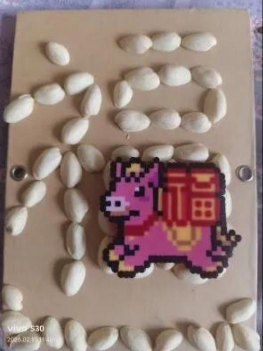 旧物新造,年味再生。利用开心果壳的自然纹理,拼贴成寓意吉祥的“福”字。既保留了果壳原本的质朴质感,又巧妙结合“开心”与“福”的美好联想,变废为宝间流淌匠心。愿这份以小见大的祝福,伴你新岁万事顺遂,福气常伴。