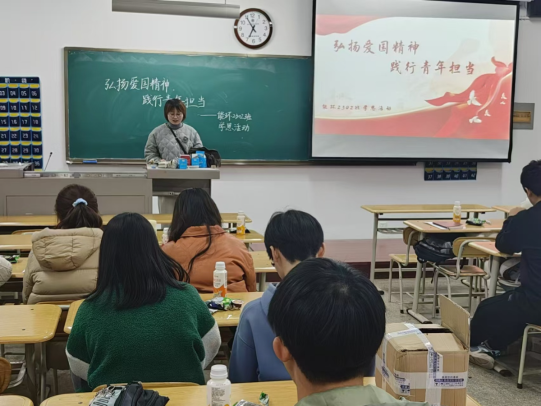在热烈庆祝中华人民共和国成立75周年之际,为深入学习贯彻习近平新时代中国特色社会主义思想,大力弘扬爱国主义精神,充分激发同学们的爱国热情,切实增强民族自豪感与使命感,2024年11月20日,能环2302班精心组织开展了以“弘扬爱国精神,践行青年担当”为主题的学思活动,本次班会由辅导员赵小舟老师主持。