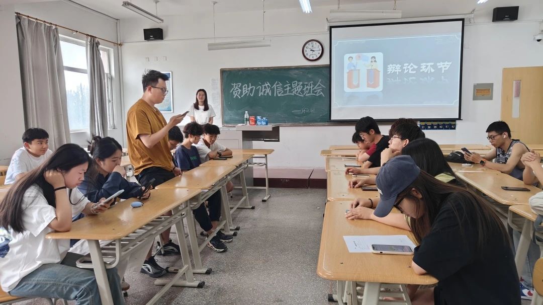 环设2301班《资助诚信辩论赛》成为我系本次主题班会活动的一大亮点。同学们围绕"资助诚信的维护应该完全依靠法律和规章制度还是应该依靠个人道德和社会责任感"这一话题展开了激烈辩论,现场氛围活跃,且班会效果显著。