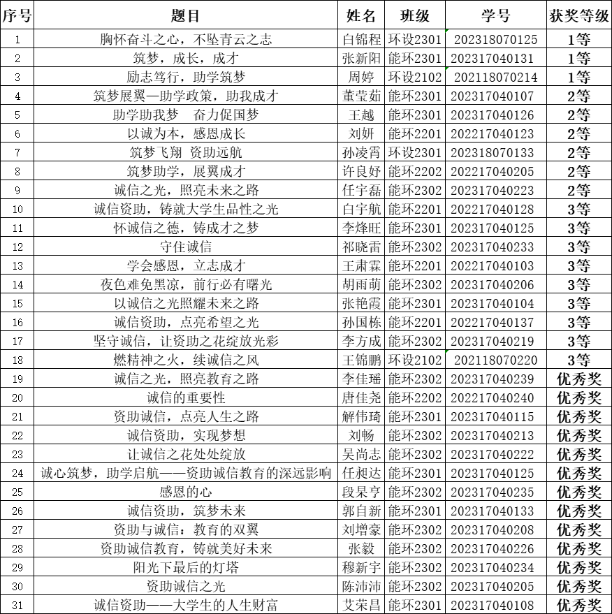 依据原创性、主题深度、文笔流畅度和思想启发性等评审准则,现将资环系资助诚信主题征文比赛的获奖名单公示如下: