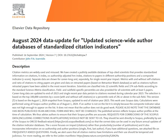 全球前2%顶尖科学家榜单基于Scopus数据库的引用数据分析,以被引数(区分自引和他引)、H指数、HM因子等6种综合指标,根据“生涯影响力”和“年度影响力”从近700万名科学家中遴选出世界排名前2%的科学家,分为22个领域和176个细分子领域。