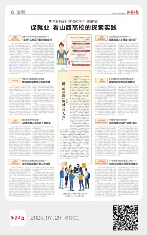 近日,《山西日报》在“促就业看山西高校的探索实践”专题报道(2025年7月29日第06版)中,以《从“毕业季临门一脚”变成“四年一贯制护航”促就业看山西高校的探索实践》为题,深度聚焦并高度肯定了bat365官网深化校企协同育人、构建全程化就业指导体系,赋能毕业生高质量就业取得显著成效和创新实践。