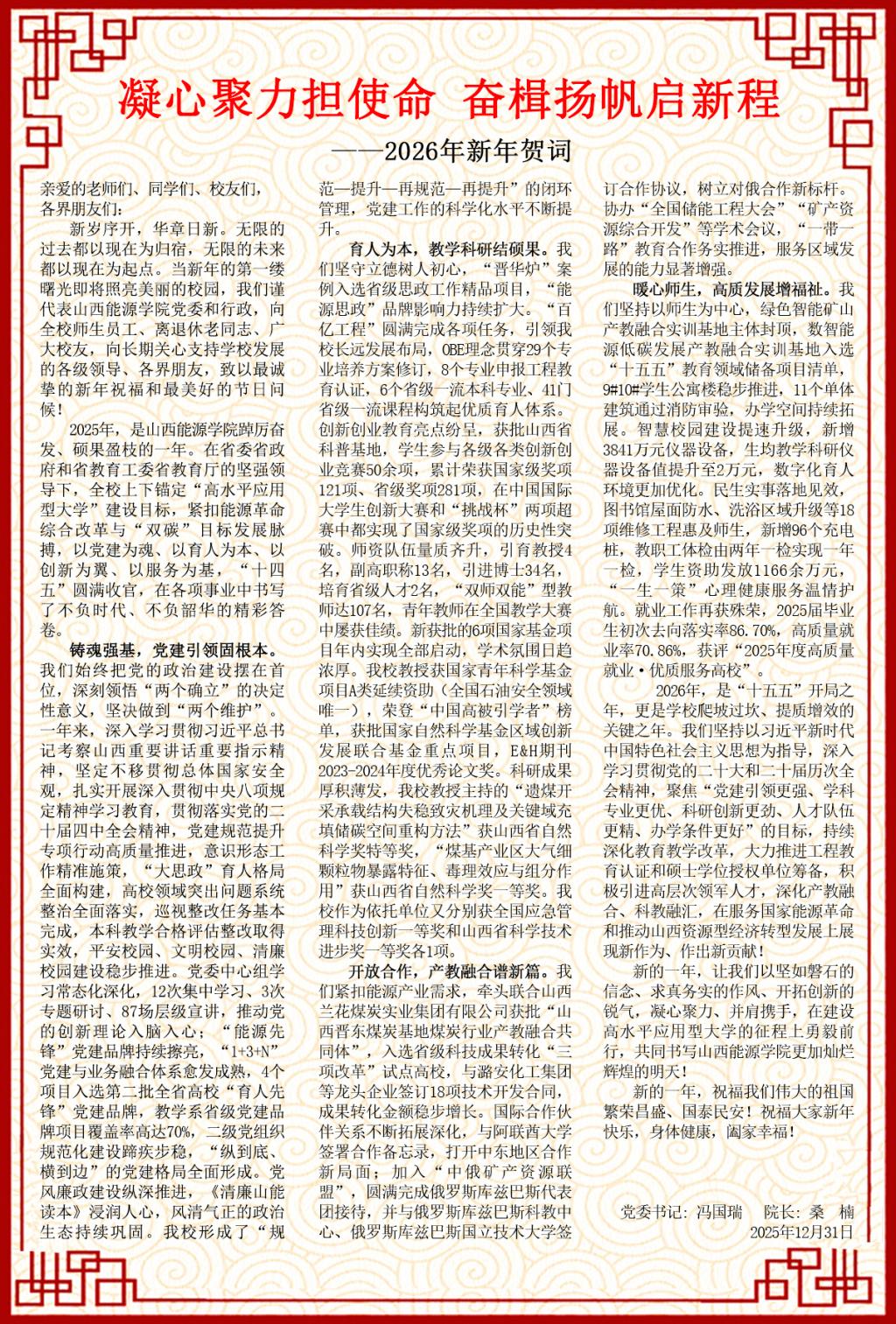 2026年,是“十五五”开局之年,更是学校爬坡过坎、提质增效的关键之年。我们坚持以习近平新时代中国特色社会主义思想为指导,深入学习贯彻党的二十大和二十届历次全会精神,聚焦“党建引领更强、学科专业更优、科研创新更劲、人才队伍更精、办学条件更好”的目标,持续深化教育教学改革,大力推进工程教育认证和硕士学位授权单位筹备,积极引进高层次领军人才,深化产教融合、科教融汇,在服务国家能源革命和推动山西资源型经济转型发展上展现新作为、作出新贡献!