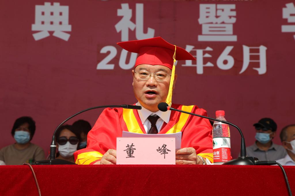 党委书记董峰发表了《担当时代使命 共创美好未来》毕业致辞。在致辞中他首先代表学院向顺利完成学业,即将进去人生新阶段的全体毕业生致以热烈的祝贺。他说,这几年,我们坚持立德树人根本任务,推动社会主义核心价值观进校园,努力构建全员全过程全方位育人格局,培养德智体美劳全面发展的社会主义合格建设者和接班人,全体教师和同学秉持“立德强能、笃学善行”的校训精神,全面加强教风学风和校风建设,同学们的思想政治、文化素质、身体素质和行为习惯等多方面都得到了锻炼和提高,校园内认真学习,奋发向上的良好风气已经形成。