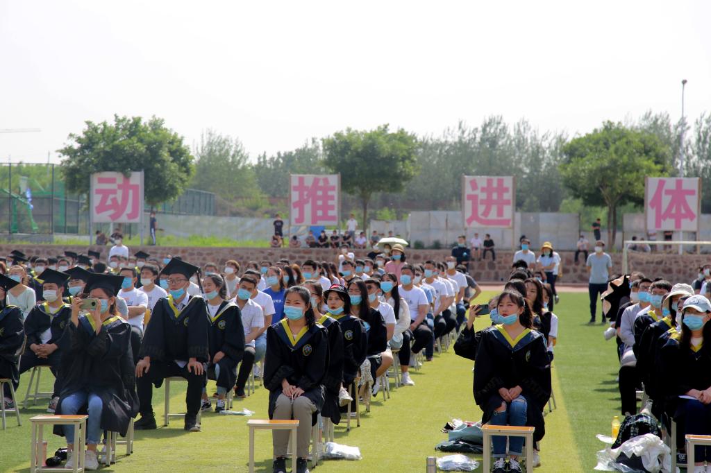 典礼期间,根据疫情防控相关工作要求,确保师生安全,全体毕业生统一按照间隔1.5米距离整齐就座,人人佩戴口罩。