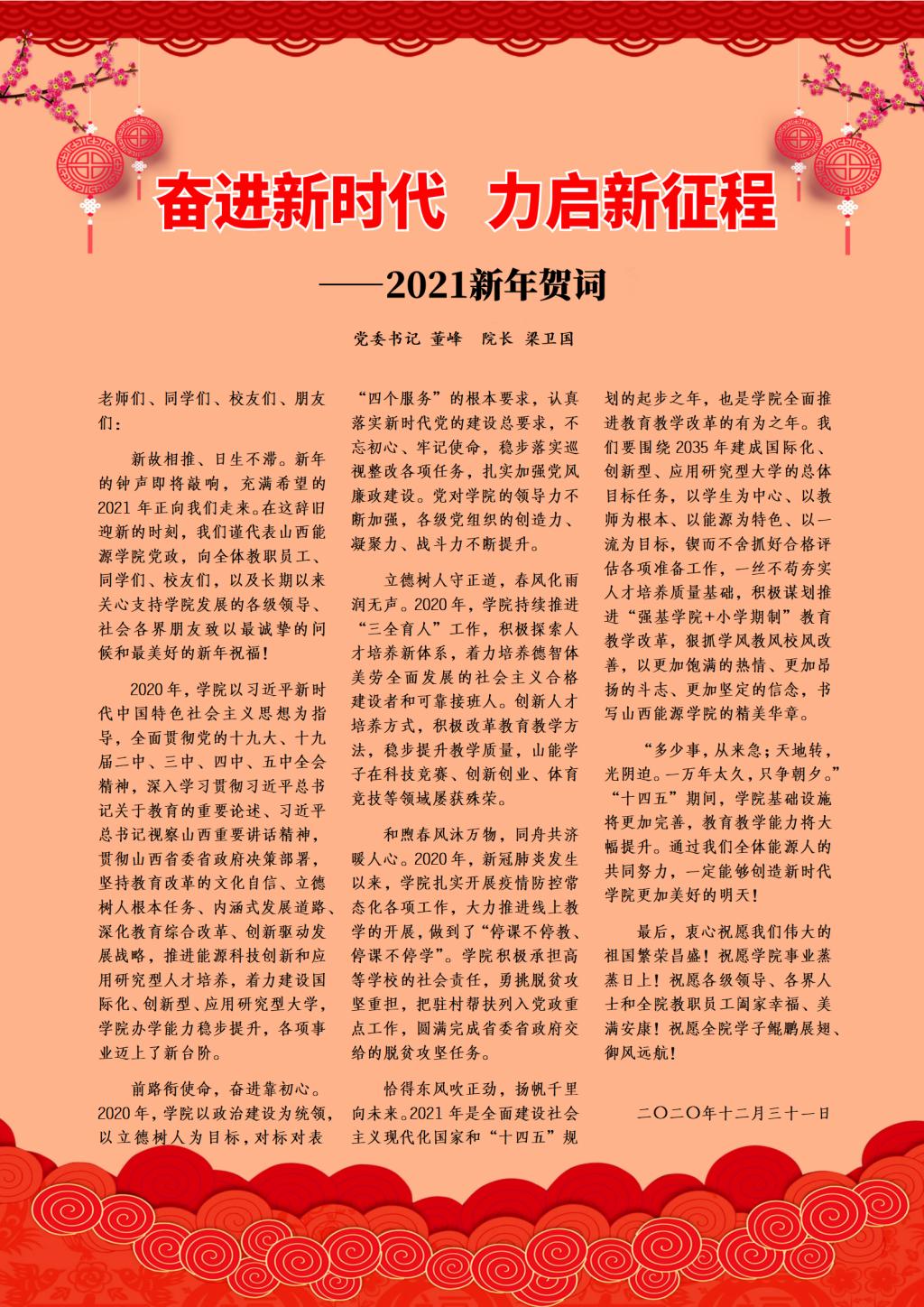 新故相推,日生不滞。新年的钟声即将敲响,充满希望的2021年正向我们走来。在这辞旧迎新的时刻,我们谨代表bat365中文官方网站党政,向全体教职员工、同学们、校友们,以及长期以来关心支持学院发展的各级领导、社会各界朋友致以最诚挚的问候和最美好的新年祝福!
