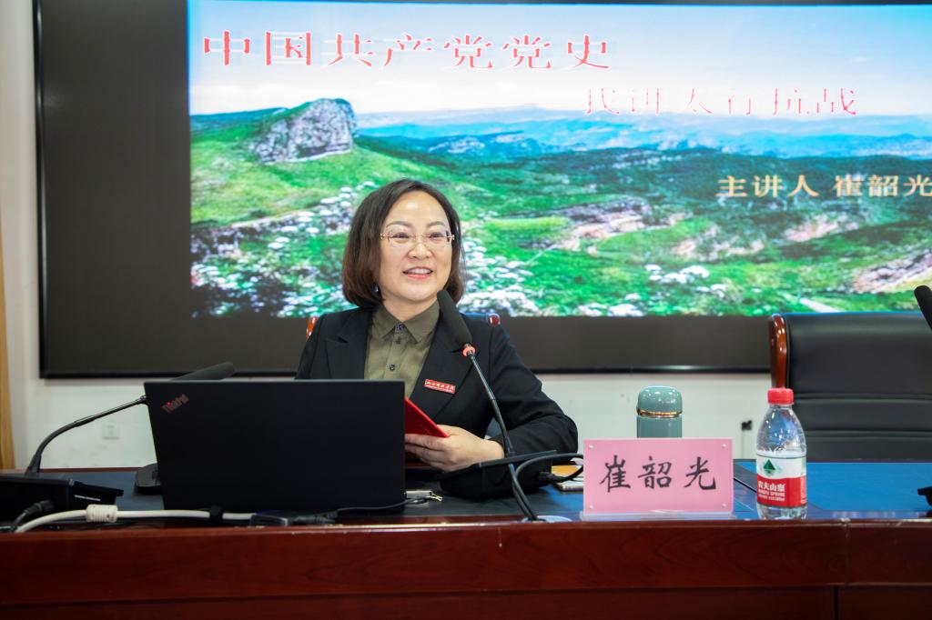 崔韶光同志的专题报告以“中国共产党党史——我讲太行抗战”为主题,从不怕牺牲不畏艰难、百折不挠艰苦奋斗、万众一心敢于胜利、英勇顽强无私奉献四个方面,讲述了中国共产党十四年抗战在太行、在整个华北领导八路军和根据地人民共御外辱的光辉历程,带领我们走进了山山埋忠骨、岭岭皆丰碑的太行革命老区,走进了共产党领导八路军英勇抗战的峥嵘岁月。报告会紧扣八路军太行抗战史这条主线,从八路军东渡黄河到平型关大捷、从长乐村战斗到关家垴战斗、从百团大战到十字岭突围……饱含深情的讲述,徐徐拉开了一幕幕人民军队浴血奋战的红色故事和一曲曲革命先烈保家卫国的动人赞歌。崔老师慷慨激昂、催人泪下的讲述,赢得现场阵阵掌声。