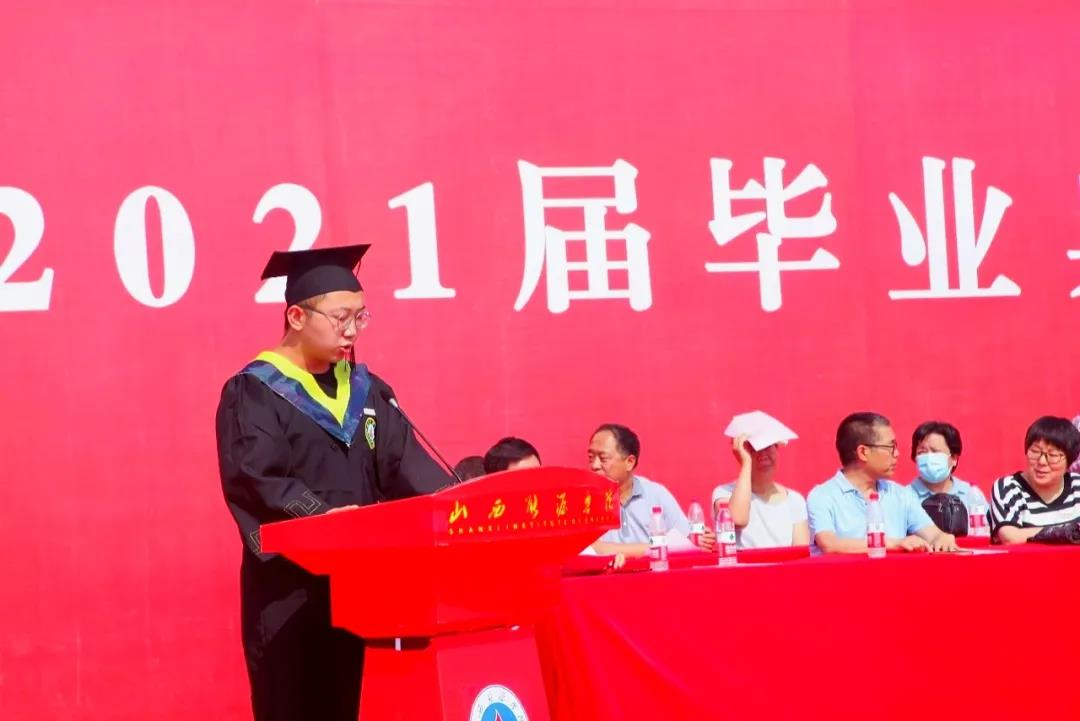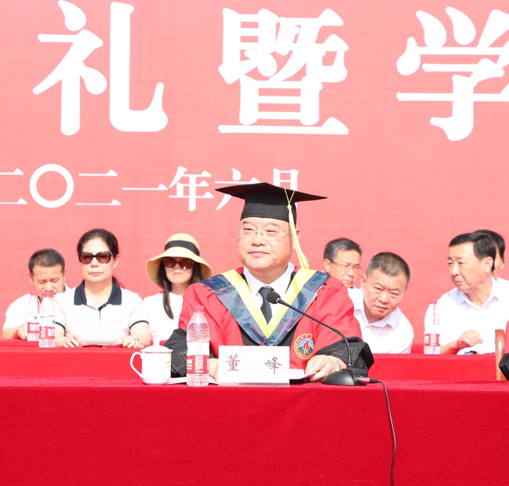 校党委书记董峰在主持讲话中向圆满完成学业的2021届本科生表示祝贺,他对毕业生们提出四点期许,一是希望他们要赓续红色血脉,坚定理想信念;二是希望他们要深植科技基因,激发创新活力;三是希望他们要把握好生活节奏,开启崭新人生;四是希望他们要勇肩时代重任,铸就无悔青春。