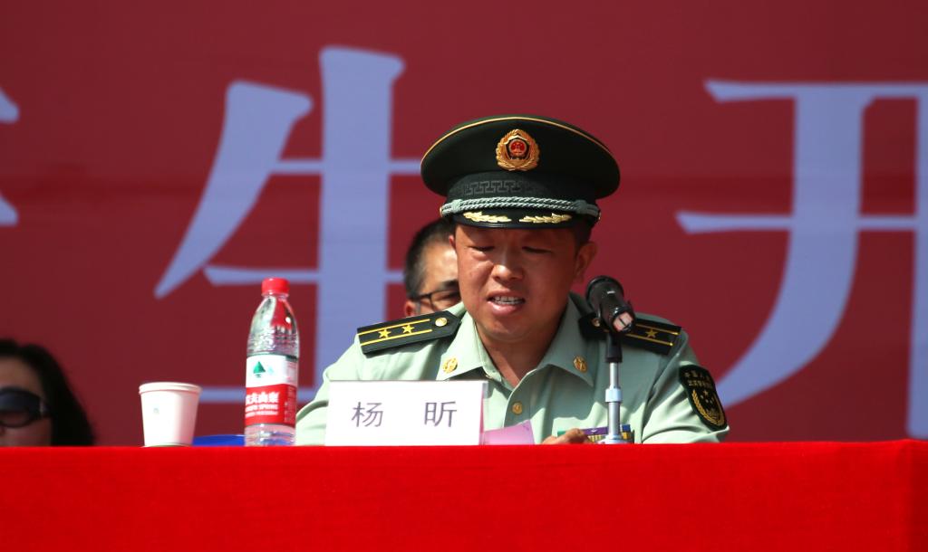 武警晋中支队参谋长杨昕同志在发言中对关心国防建设和双拥工作的学院领导表示了感谢,对全体新生表示祝贺,对即将迎来的军训工作他提了三点希望,一是希望同学们了解“国防”教育的重大意义;二是希望同学们珍惜“军训”的宝贵时机;三是希望全体教官担当起“承训”的光荣使命。