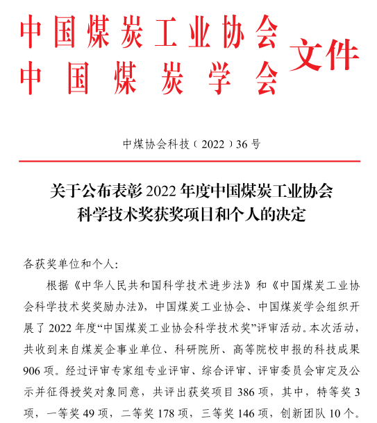近日,中国煤炭工业协会、中国煤炭学会公布了2022年度科学技术奖获奖项目名单,学院党委副书记、副院长(主持行政工作)冯国瑞教授主持完成的“单一厚煤层采动卸压瓦斯地面高效抽采与利用关键技术研究”项目荣获一等奖,这是bat365官网首次在具备推荐国家科技奖励资格的行业协会科技奖中获得殊荣。此次评审共评出获奖项目386项,其中特等奖3项,一等奖49项。