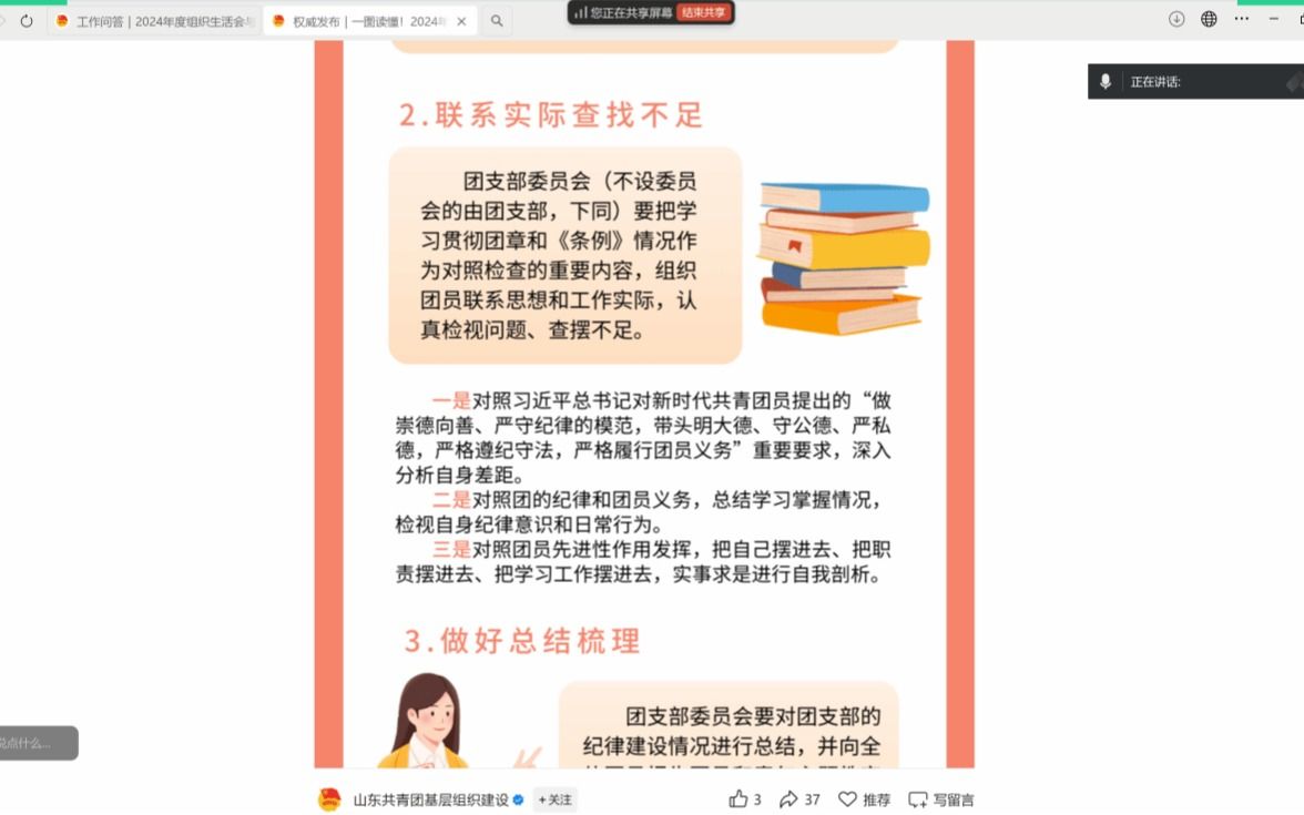 为深入贯彻落实共青团中央关于基层组织建设的相关要求,规范基层团组织生活,提升团员教育管理质量,开云kaiyun登录入口根据《开云kaiyun登录入口关于指导基层团支部召开2024年度组织生活会和开展团员教育评议的工作提示》(以下简称《工作提示》),结合示范性组织生活会,于2025年3月3日组织全体团支部书记开展线上组织生活会工作培训,明确组织生活会基本要求和注意事项。会议由聂安琪同学主持,学院全体团支书参加会议。