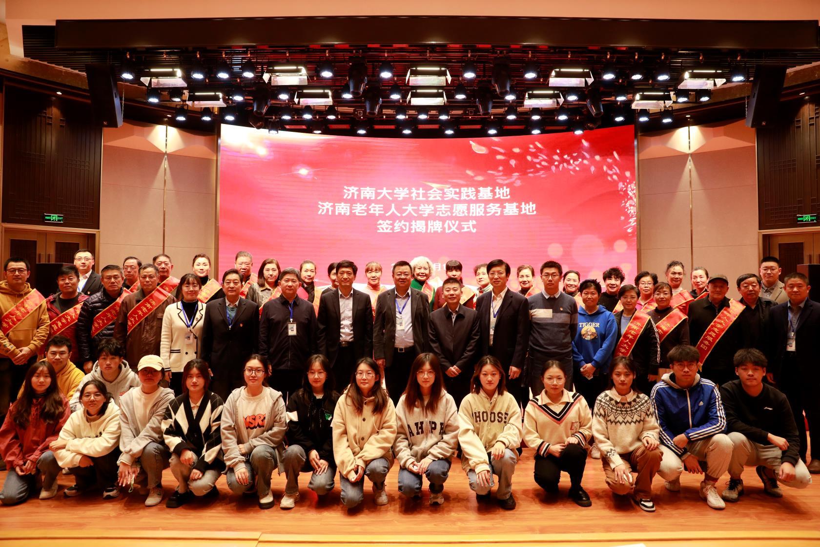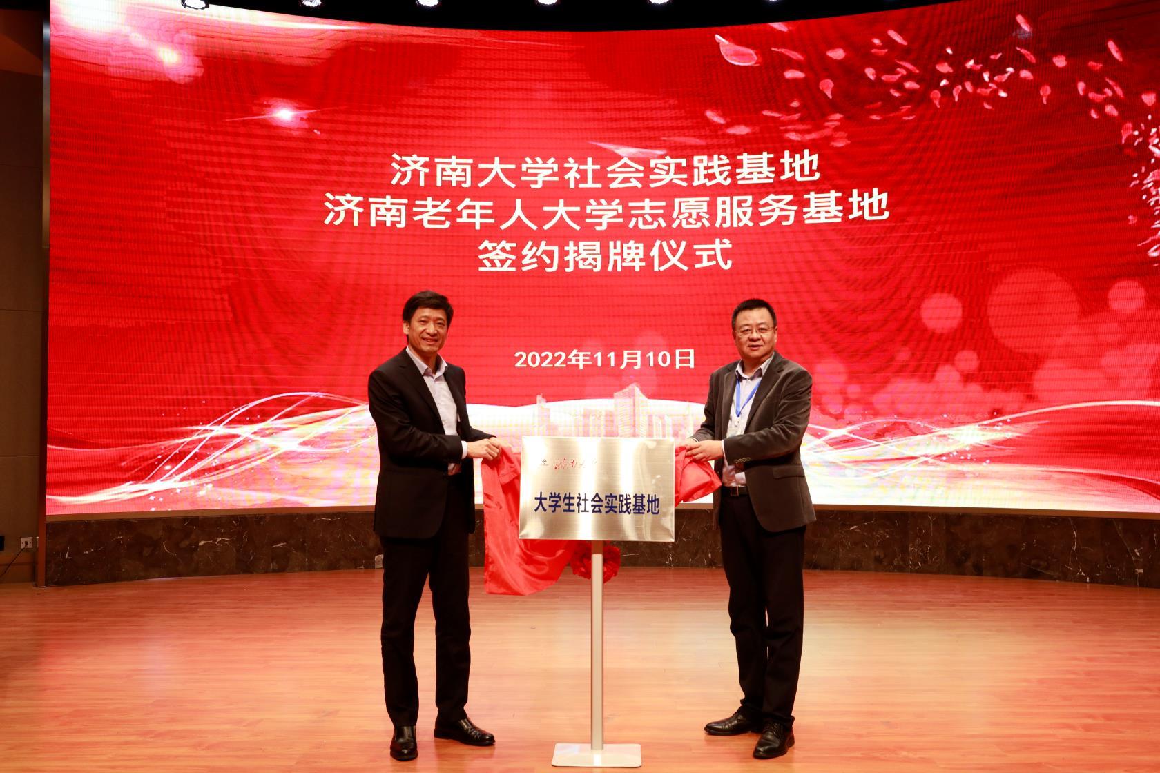 仪式上,双方签订了合作共建协议书。王磊、李晓钟共同为“济南老年人大学志愿服务基地”揭牌,孟德洋、温洪军共同为“开云kaiyun登录入口大学生社会实践基地揭牌”。