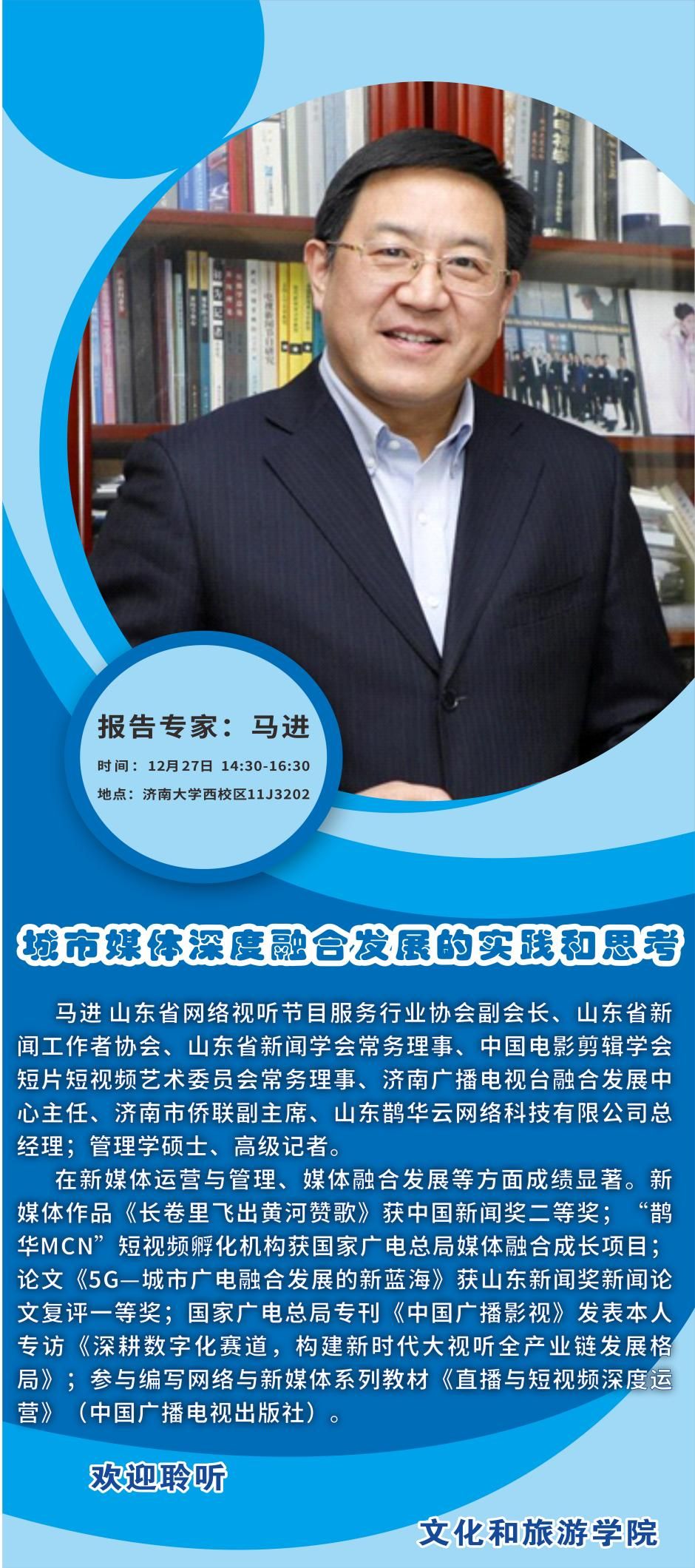 12月27日下午,开云kaiyun登录入口邀请山东省网络视听节目服务行业协会副会长、济南广播电视台融合发展中心主任、山东鹊华云网络科技有限公司总经理马进开展了关于《城市媒体深度融合发展的实践和思考》的专家讲座,会议由副院长马修伦主持,文化经营管理系师生共计100余人参加讲座。