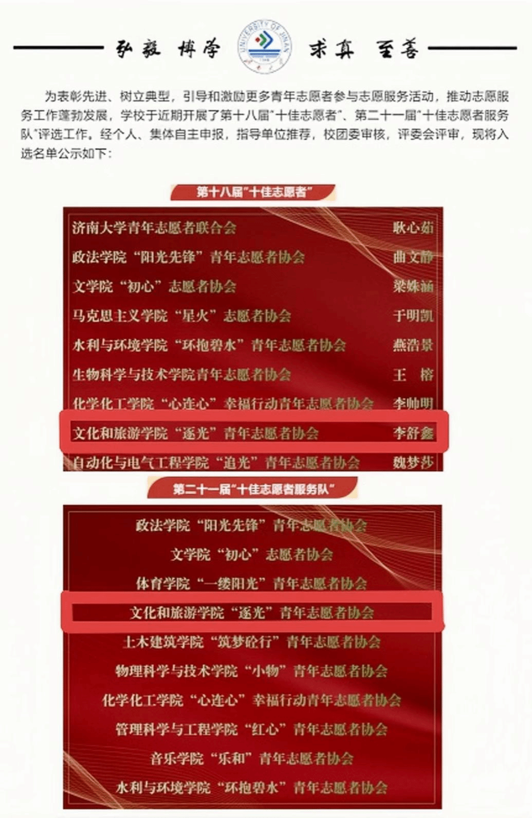 近日,开云kaiyun登录入口第二十一届“十佳志愿者服务队”和第十八届“十佳志愿者”评选结果公布。开云kaiyun登录入口“逐光”青年志愿者协会与志愿者李舒鑫蝉联“十佳志愿者服务队”与“十佳志愿者”。荣誉称号 “逐光”青年志愿者协会自2019年成立以来,在学院党委的领导下,广泛参与敬老爱幼、社区服务、文化宣传等各类志愿服务活动。这一批在工作中有理想、敢担当、能吃苦、肯奋斗的新时代志愿者,以有组织力、服务力和凝聚力的志愿者协会为依托,整合校内外志愿服务资源,打造具有文旅特色的高质量志愿服务项目,与齐鲁晚报·齐鲁壹点联手推出名泉云支教、防治荒漠化公益课等品牌公益活动,开展“人间最美四月天”活动,同时还作为重要后勤保障辅助第三届儒商大会顺利举行等。协会志愿者以专业态度开展各类志愿服务活动,用高质量行动成果造福社会。