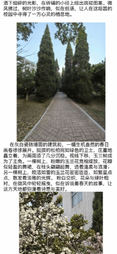 接下来,让我们欣赏一下获得一等奖的文管2403史佳怡同学和烹饪23H2田雪晶同学的作品,她们的作品将校园春色定格为永恒,赋予自然新生,重构了对自然生态的认知。