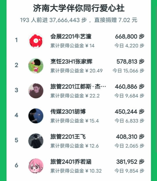 活动一经启动,文旅学子们踊跃报名,纷纷扫码加入伴你同行爱心社战队。193 名同学积极参与,累计捐赠步数达 37666443 步。他们每日坚持打卡,以实际行动为乡村孩子送去温暖午餐的希望。