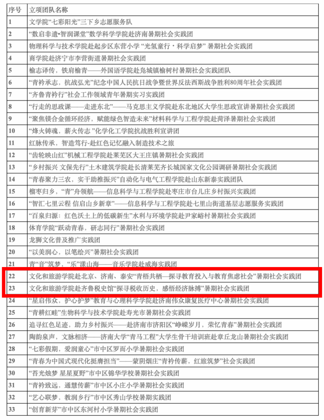 此次暑期 “三下乡” 社会实践活动筹备期间,学院积极动员、广泛宣传,鼓励学生结合专业特色与社会需求组队申报。经团队自主申报、学院团委排序推荐、校团委评审,我校最终确定33支队伍校级重点团队立项。其中,我院赴北京、济南、泰安“青梧共栖-探寻教育投入与教育焦虑社会”暑期社会实践团、赴齐鲁税史馆“探寻税收历史,感悟经济脉搏”暑期社会实践团从众多申报团队中脱颖而出,成功获得校级重点团队立项。