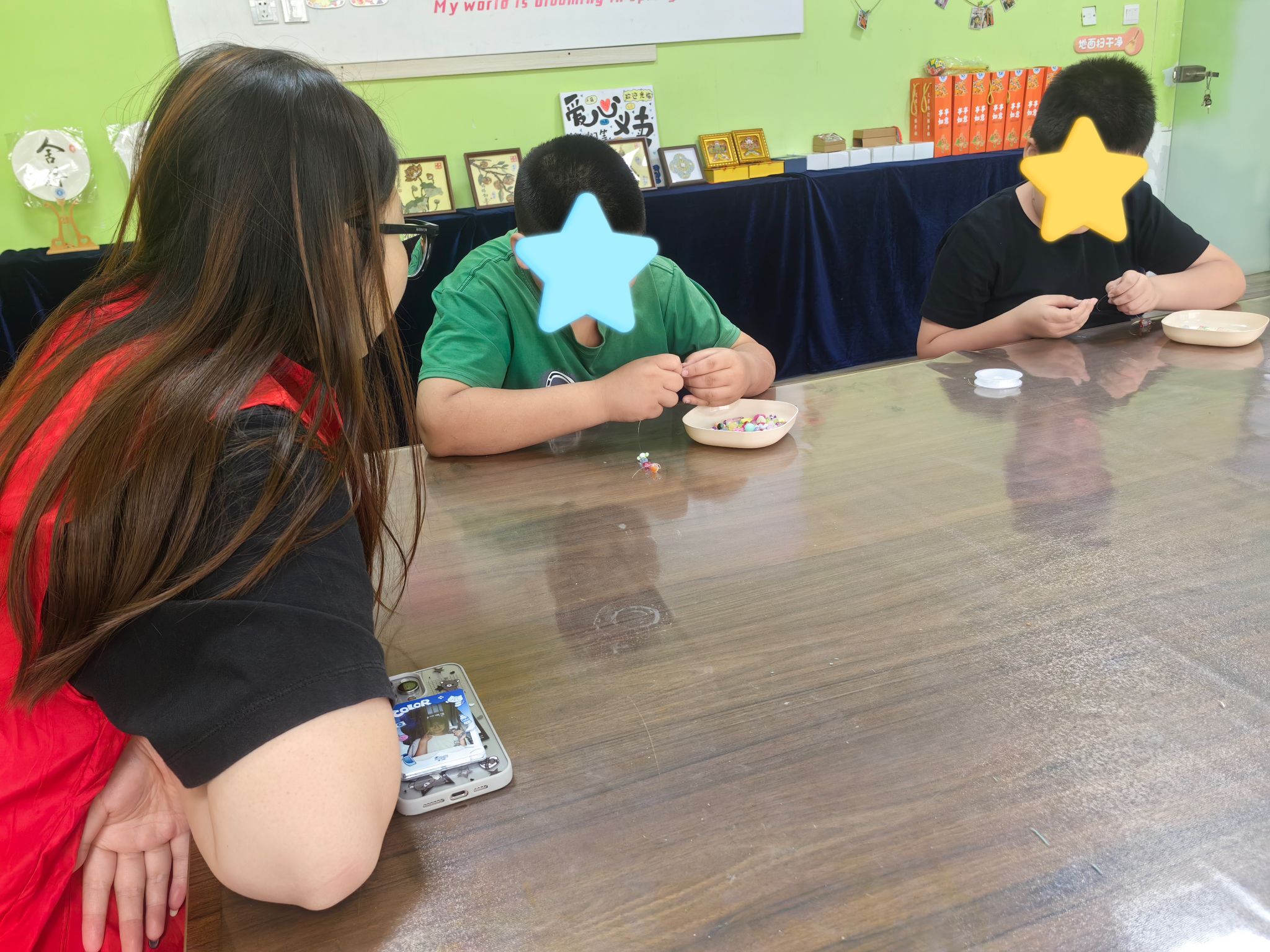 “指尖魔法 —— 手工串珠课堂” 率先拉开帷幕。志愿者将提前准备好的材料包分发给每个孩子:柔软的彩色棉绳和圆润的琉璃珠,这些物品瞬间勾起了孩子们的好奇心。志愿者刘思彤手持材料,一边慢速示范,一边用温柔的语气讲解步骤,还特意强调 “颜色搭配可以随心所欲,喜欢的样子就是最好的样子”。孩子们听得格外认真,半小时后,一条条形态各异的手链陆续完成。孩子们举起手腕上的作品,对着镜子反复欣赏,脸上的笑容比手中的珠子还要明亮。