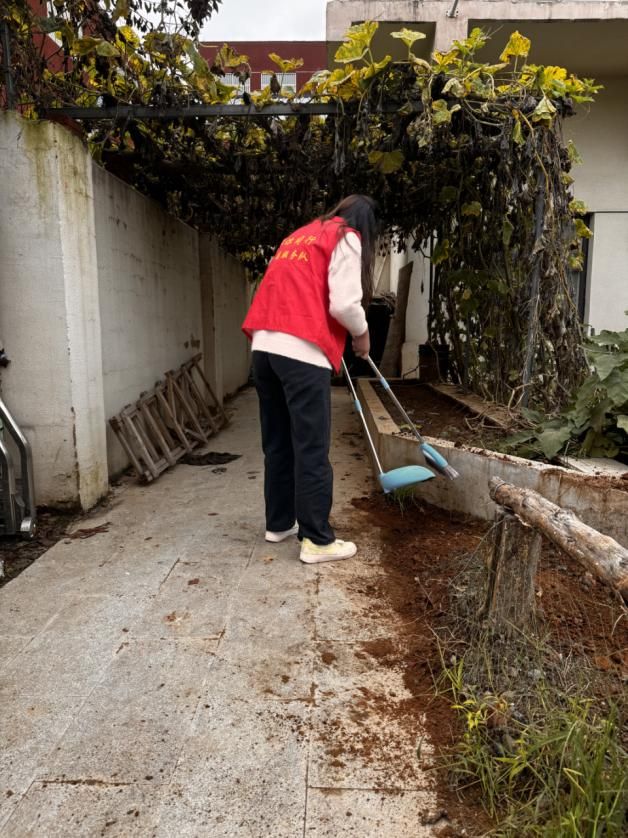 花园施肥后,“卫生清洁行动”紧接着开展。志愿者们拿起扫帚、抹布等,一起清理花园、教室。他们分工协作,凭借团队配合以及高效的服务能力,很快就为孩子们创造了一个干净整洁的成长空间。在无声的劳作中,志愿者将“对他人负责、对环境尽责”的意识悄悄传递,让干净的空间不仅是物理层面的舒适,更成为滋养孩子“公共意识”的成长土壤。