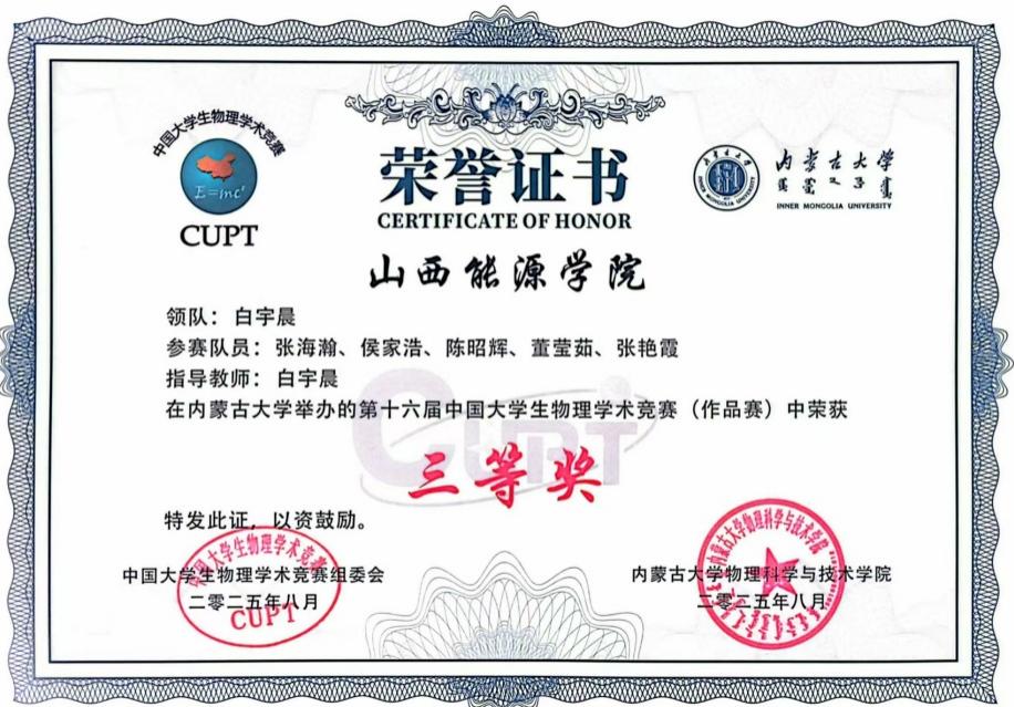 8月14日至18日,第十六届中国大学生物理学术竞赛(CUPT)全国赛在内蒙古大学隆重举行。bat365官网强基学院物理教研室通过选拔,组建了一支由机电系、资环系学生构成的参赛队伍,并在比赛中表现优异,最终斩获全国三等奖。
