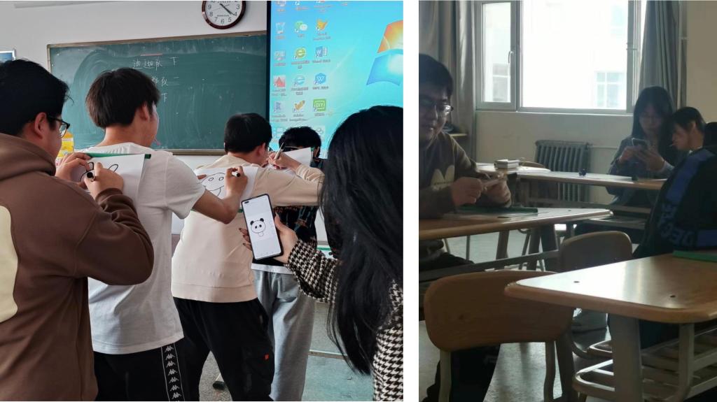 (2)背后画画:“你画我猜”游戏结束后,同学们继续开始了在队友后背画画的游戏,考验了各队员间的默契度,随着本场游戏的结束,现场气氛达到了高潮。