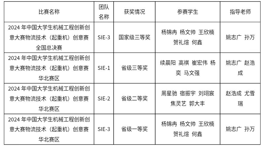 在 2024 年中国大学生机械工程创新创意大赛物流技术(起重机)创意赛中,收获可谓十分丰富。通过参与此次大赛,学生们不仅在专业知识和技能方面得到了极大的提升,还学会了团队协作与沟通。在紧张激烈的比赛过程中,让学生们不断挑战自我,挖掘自身潜力,培养了坚韧不拔的意志品质。同时,与来自全国各地的优秀学子同场竞技,拓宽了视野,了解到行业的前沿动态和创新方向。这场比赛为学生们的大学生活增添了浓墨重彩的一笔,也将成为这些比赛成员人生中宝贵的财富。