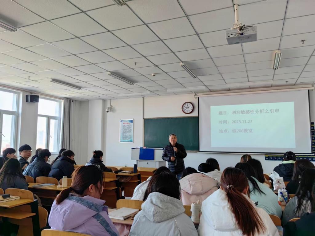 2023年11月27日上午,经济系为财务管理专业学生举办了一场专题讲座。本次讲座由我系特聘教授刘小明老师主讲,题目是“利润敏感性分析之引申”。财务管理专业2021级七十多名同学参加。