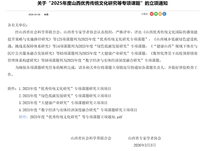 2026年3月3日,山西省社会科学界联合会、山西省专家学者协会联合发布了“2025年度山西优秀传统文化研究等专项课题”的立项通知,经济系教师朱丽丽、郭晟熙、何丽娟申报的课题成功入选。