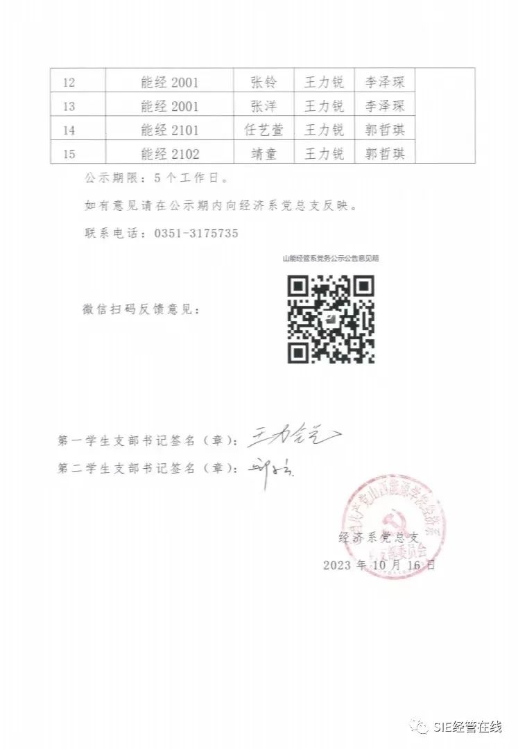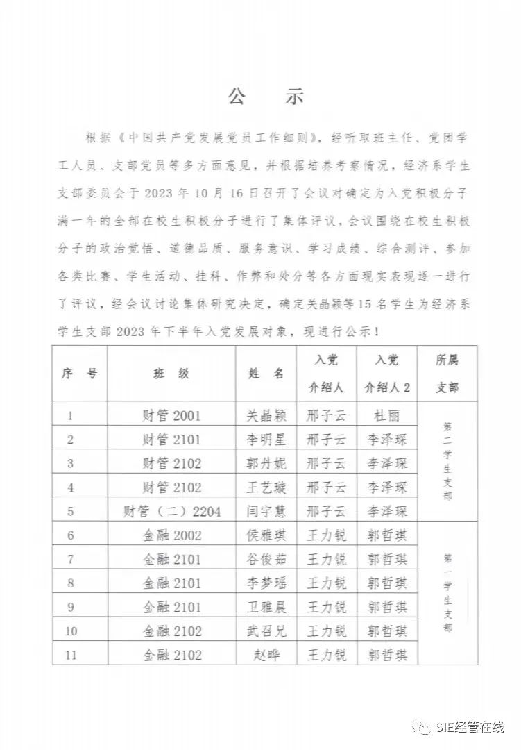 根据《中国共产党发展党员工作细则》,经听取班主任、党团学工人员、支部党员等多方面意见,并根据培养考察情况,经济系学生支部委员会于2023年10月16日召开了会议对确定为入党积极分子满一年的全部在校生积极分子进行了集体评议,会议围绕在校生积极分子的政治觉悟、道德品质、服务意识、学习成绩、综合测评、参加各类比赛、学生活动、挂科、作弊和处分等各方面现实表现逐一进行评议,经会议讨论集体研究决定,确定关晶颖等15名学生为经济系学生支部2023年下半年入党发展对象,现进行公示!