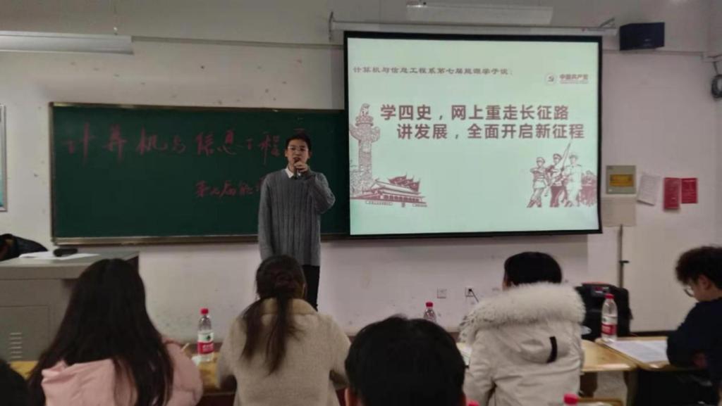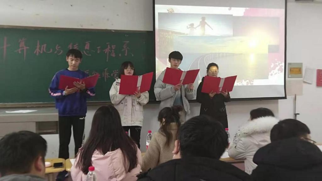 诗歌朗诵组的卢晓闯同学将情景表演与诗歌朗诵有机结合,场面震撼人心;文武阳同学饱含深情地诵读革命诗词,同学们沉浸在毛主席诗词的巨大魅力中,深切感受一代伟人的革命情怀和豪迈气概,仿佛又回到了那个家国相忧、血火相淬的峥嵘岁月。主题演讲组的白志武同学将自己的演讲与音乐完美融合,对在全党全国各族人民共同抗疫中展现出来的英雄进行了赞美和讴歌,使同学们更加坚定了为实现中华民族伟大复兴而努力学习的决心。