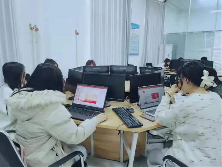 专职辅导员赵彩霞老师来到考场,巡视参赛同学的完成情况。各监考人员也尽职尽责。