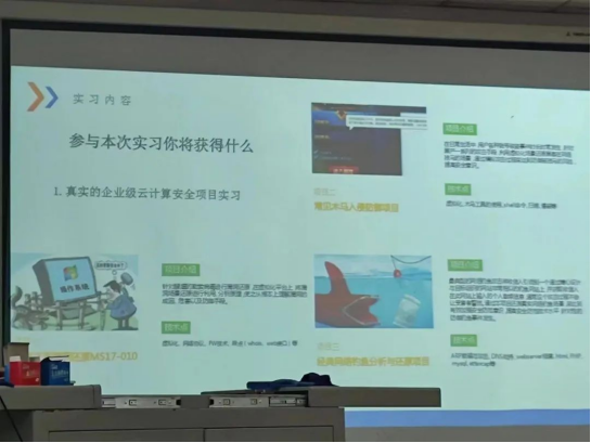 本次宣讲从我们生活中常见的网络安全开始,介绍了网络安全行业的发展趋势,之后介绍了高效就业所需的技能,最后向同学们展示了公司的实习过程。