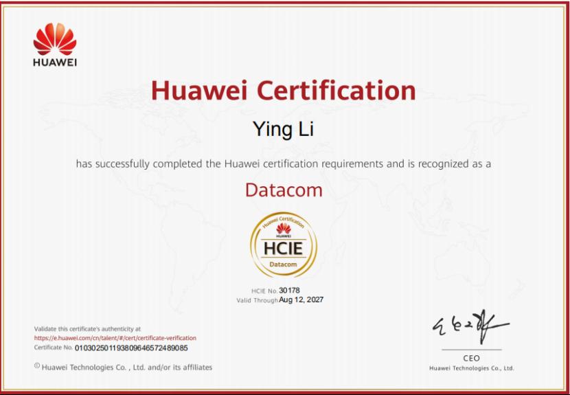 成果12:bat365中文官方网站信息管理专业大四学生李盈通过HCIE证书